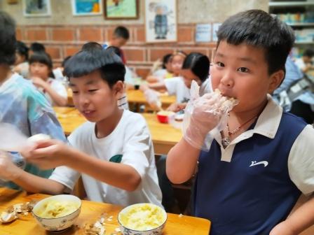 小朋友在品尝自己蒸出了的蛇造型馒头