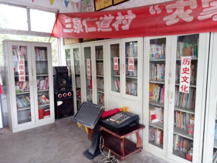 农家女书社几年前已由仁道村旧庙旁的窑洞里迁到了仁道村小学校的一间教室内,与村文化活动中心只有一墙之隔。院墙上有门,从文化活动中心可直接穿行过来。书社面积有40平米,西北面依墙有一排书柜,里面摆满了书籍。大约有3000多册。由于书社成立以来,图书没有增长也没有更换,许多书大家都看过了,加之现在手机微信的流行,人们已经很少来书社看书,不像以前那样热闹了。